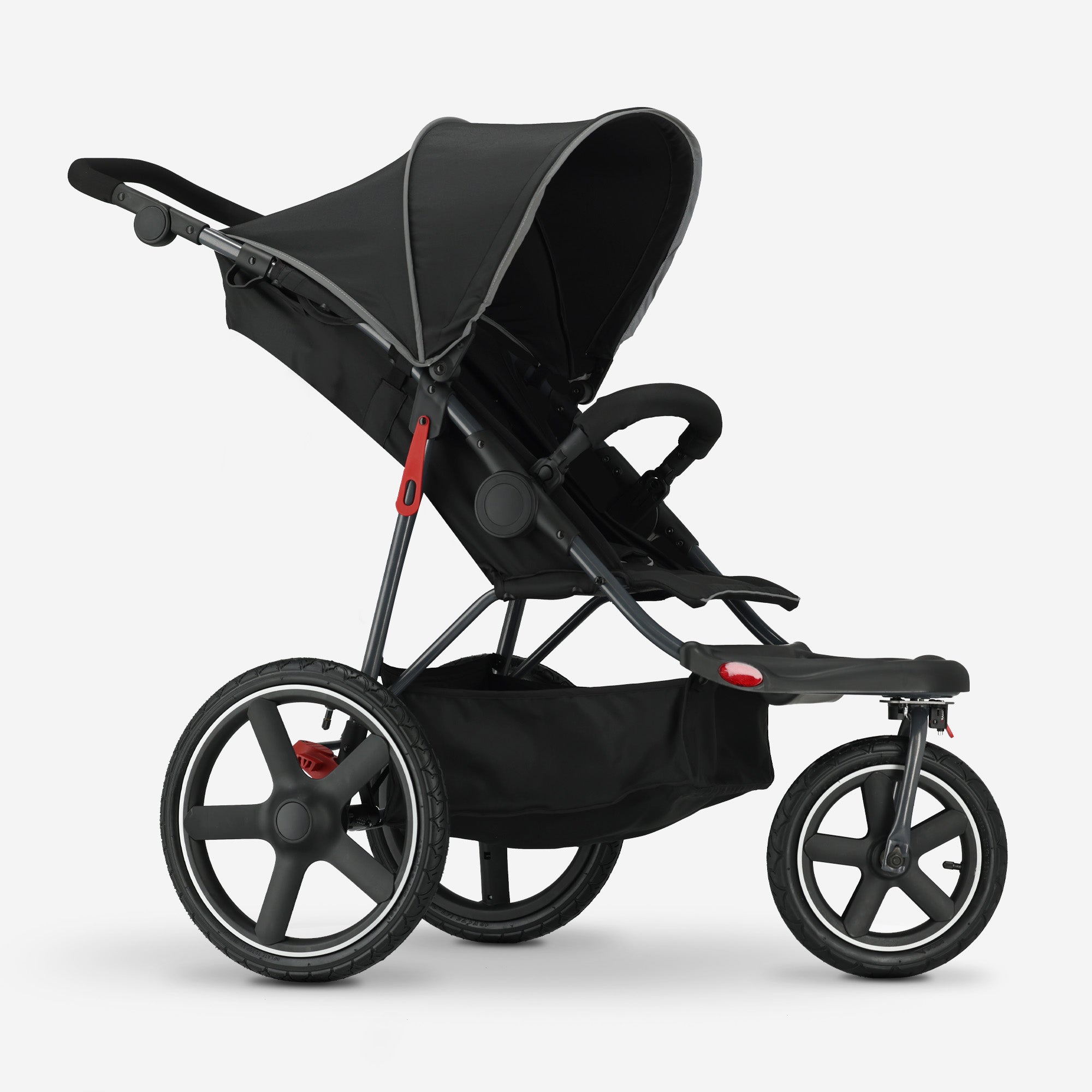 Easy to foldSmooth rideAll-terrain pneumatic tiresAdjustable backrest and handlebarMosquito net and air pump included